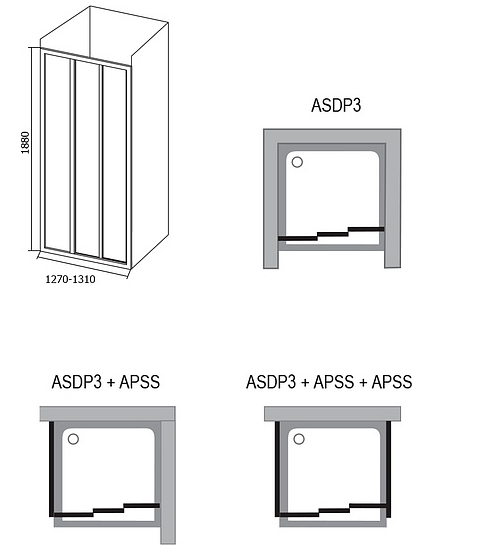 Изделие состоит из одной неподвижной части и двух подвижных частей. Повернув изделие на 180°, получите левый/правый варианты входа. Устанавливается в облицованный кафелем угол ванной комнаты на поддоны RAVAK ANETA, ANGELA, PERSEUS, PERSEUS PRO, PERSEUS PRO FLAT, PERSEUS PRO CHROME, GIGANT PRO, GIGANT PRO FLAT, GIGANT PRO CHROME или непосредственно на пол со встроенным душевым каналом или трапом. Комбинируя одну неподвижную стенку типа APSS с душевыми дверьми можно создать «Г»-образный душевой уголок. С помощью двух неподвижных стенок типа APSS и душевых дверей образуете «П»-образный душевой уголок. Возможно изготовление атипичных душевых дверей.