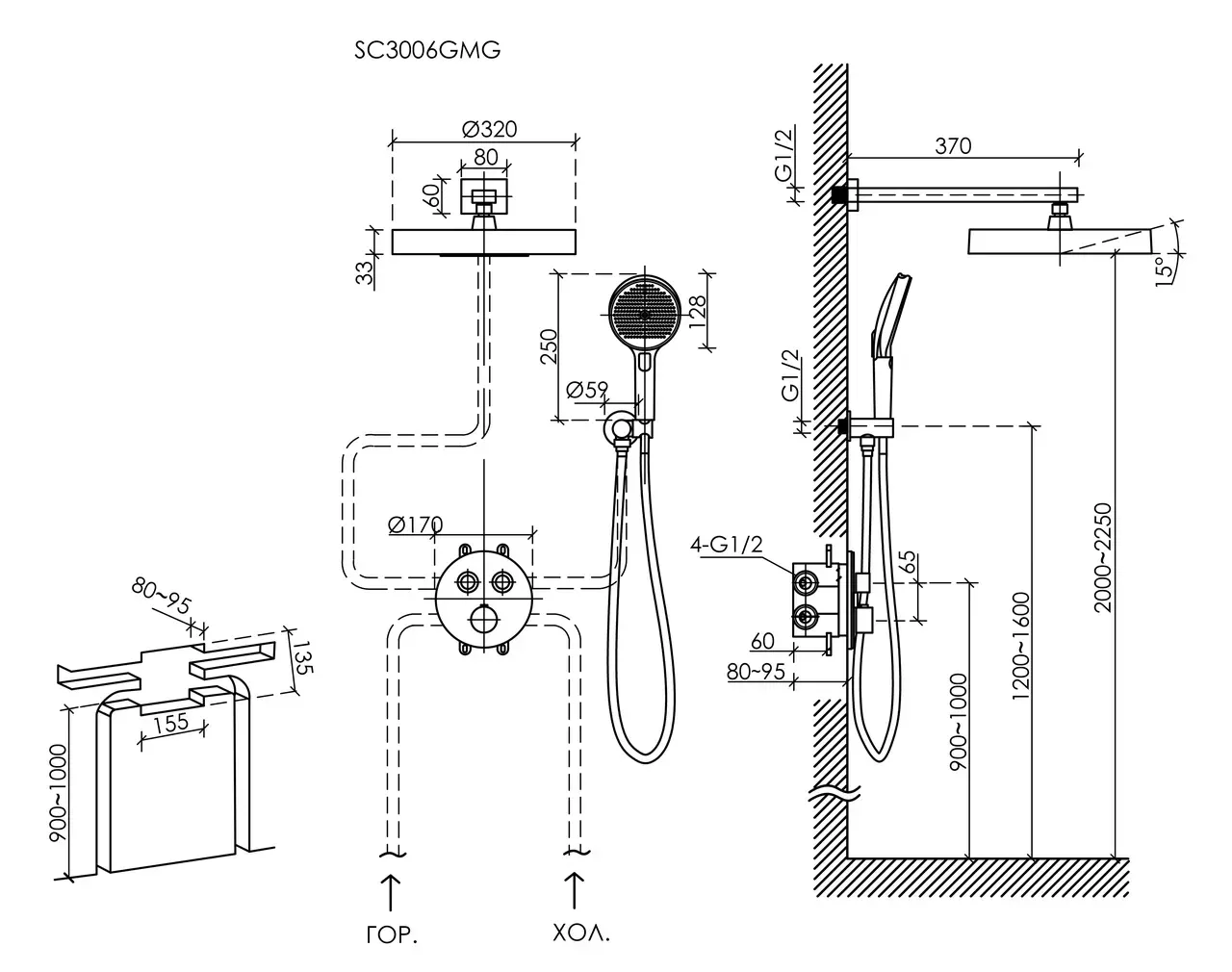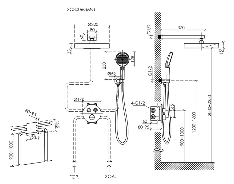 Душевой комплект SANCOS Space встраиваемый, c термостатическим смесителем, верхним, ручным душем и шлангом в комплекте, цвет вороненая сталь, арт. SC3006GMG