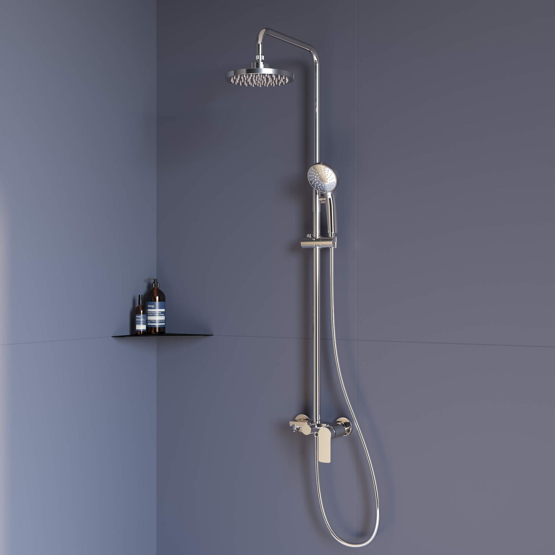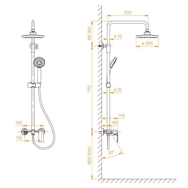 • Стальная штанга с регулировкой высоты головного душа