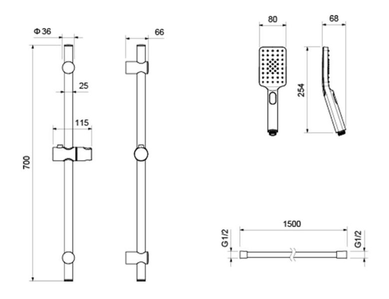 • Душевой гарнитур: душевая стойка, лейка, шланг