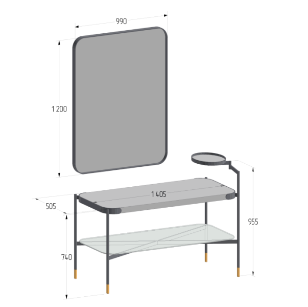 Каркас из чёрного металла с отделкой из латуни дополнен столешницей из материала S-Stone и полкой из рифлёного стекла, напоминающего поверхность водной глади. Зеркало в скоординированном дизайне создаёт законченный образ.