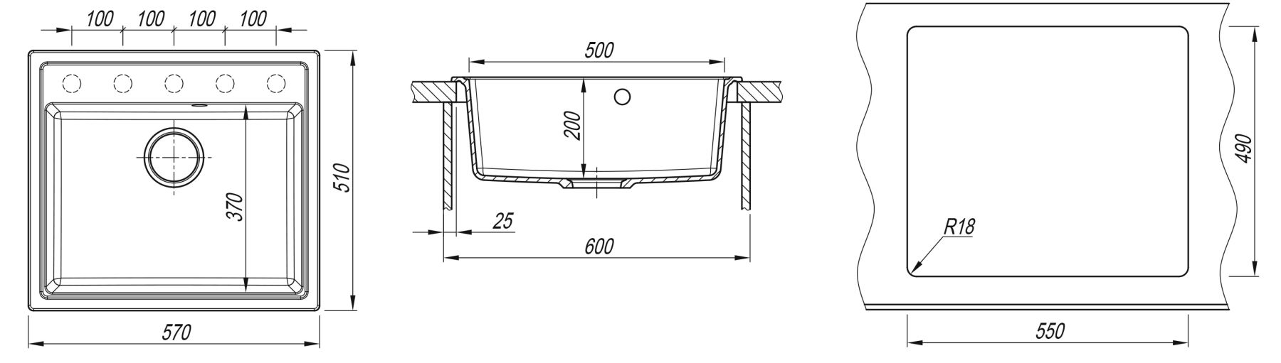 • Отверстия под смеситель: