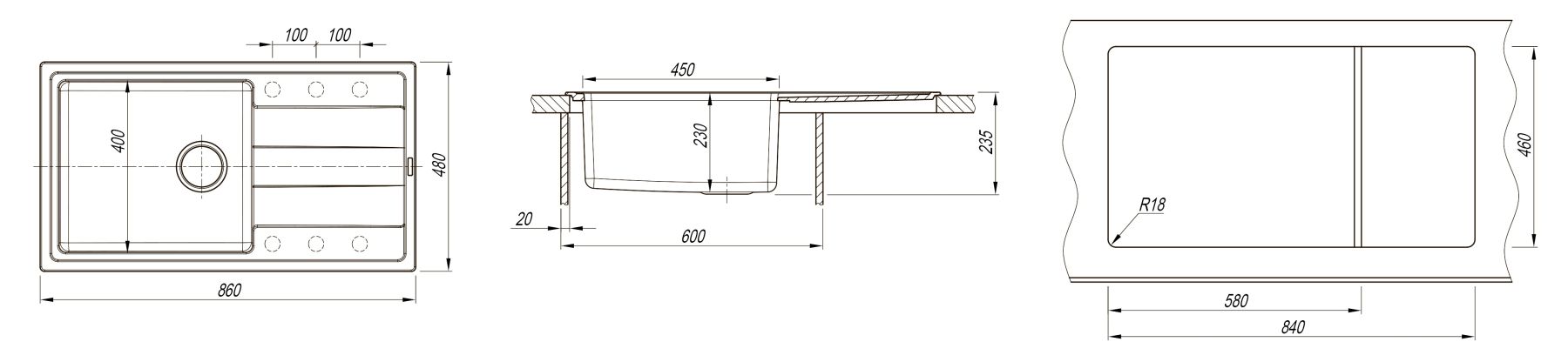 В модели предусмотрены шесть отверстий для смесителя, а также для различных аксессуаров, что избавит от лишних предметов на столешнице.