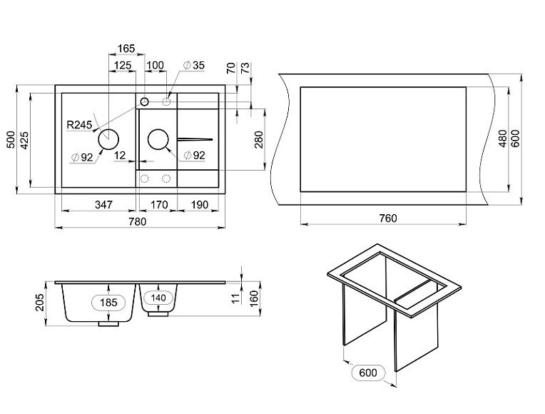 Габариты дополнительной чаши, мм