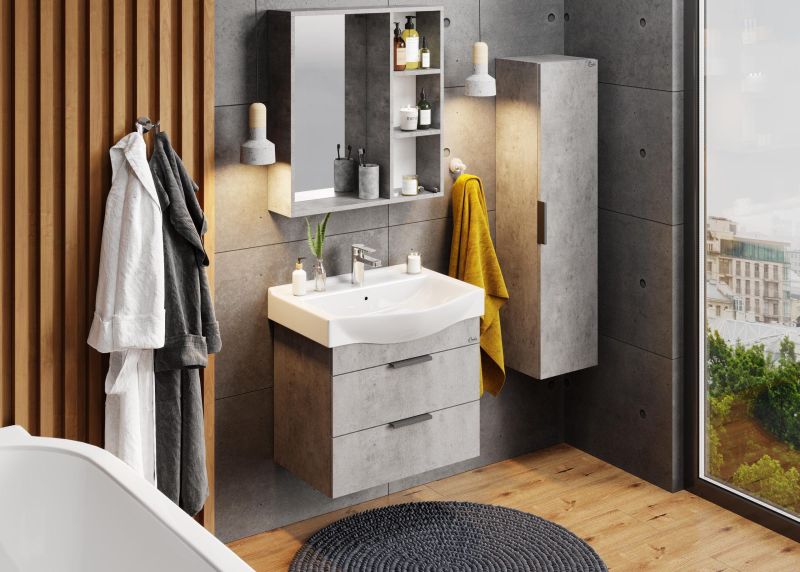 Подвесной шкаф пенал для ванной комнаты Onika ДЕВИС 30 отличается чёткой геометрией форм и создан для тех, кто ценит современный лаконичный дизайн, холодный брутальный эффект бетона чикаго, а также безупречное исполнение.