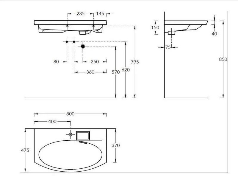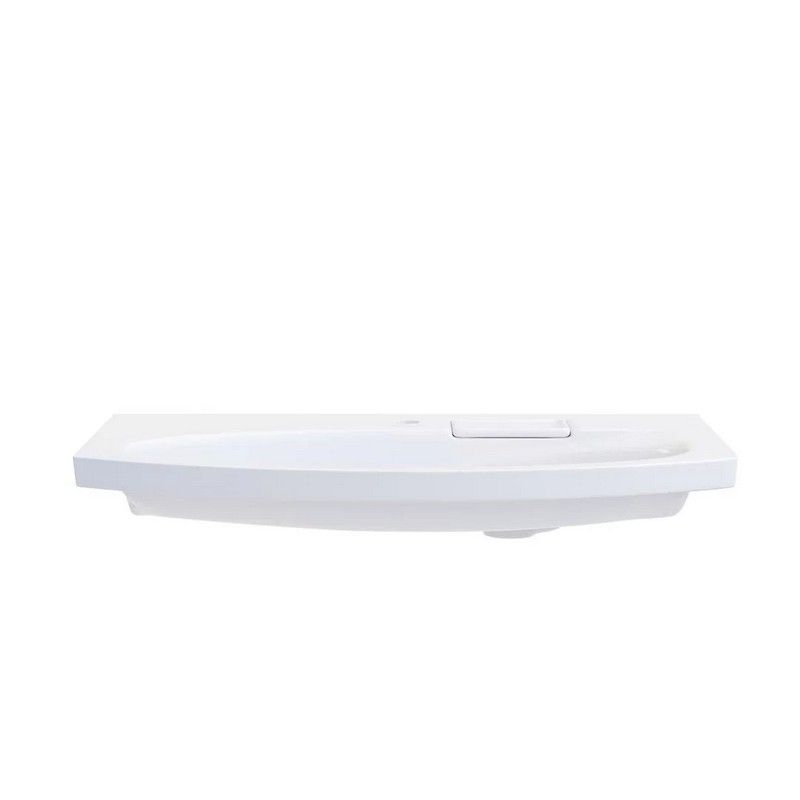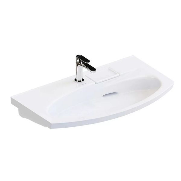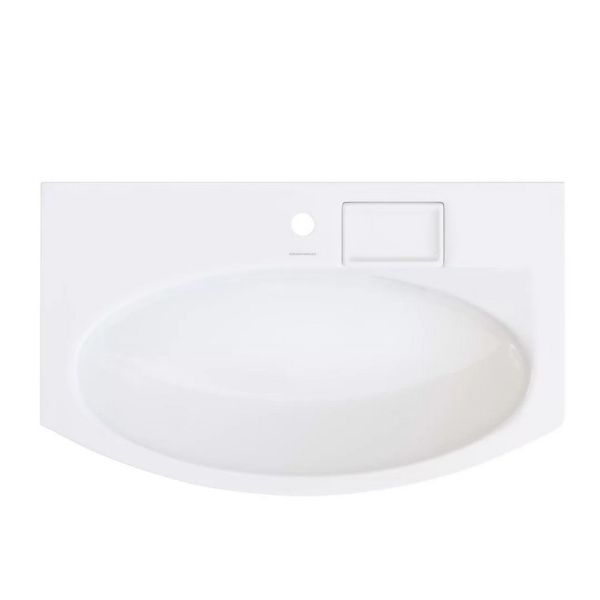Изогнутая мебельная раковина 80 см без необходимости использования донного клапана, ширина 80 см. Отверстие слив\перелив спрятано в небольшой бокс, закрытый керамической крышкой с бортиком. Чаша раковины расположена в центре. Сочетается с тумбами серии RIVA.