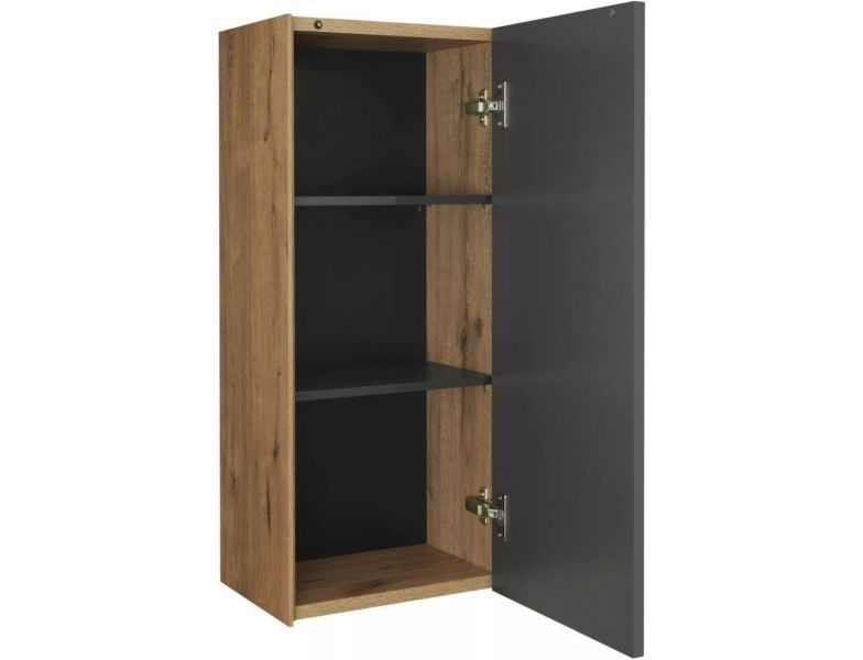 Дополняет коллекцию предметов мебели Сохо шкафчик в созвучном дизайне: боковые стенки ЛВДСП Дуб веллингтон, фасад –плита МДФ в пленке с покрытием soft touch в цвете антрацит. Внутри полки из ламинированной влагостойкой ДСП в цвете антрацит.