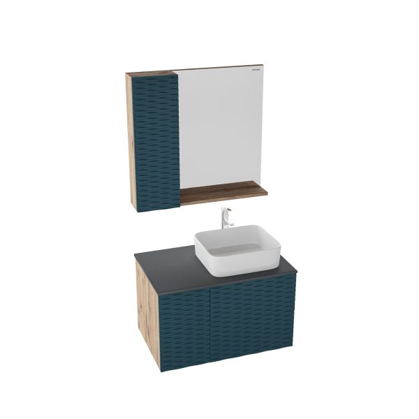 Шкаф-зеркало Альба 80 см отражает современные тенденции в дизайне мебели для ванных комнат: матовая пленка в цвете Бриз с 3D рисунком безупречно сочетается с текстурой под дерево, отсутствие лишних деталей.