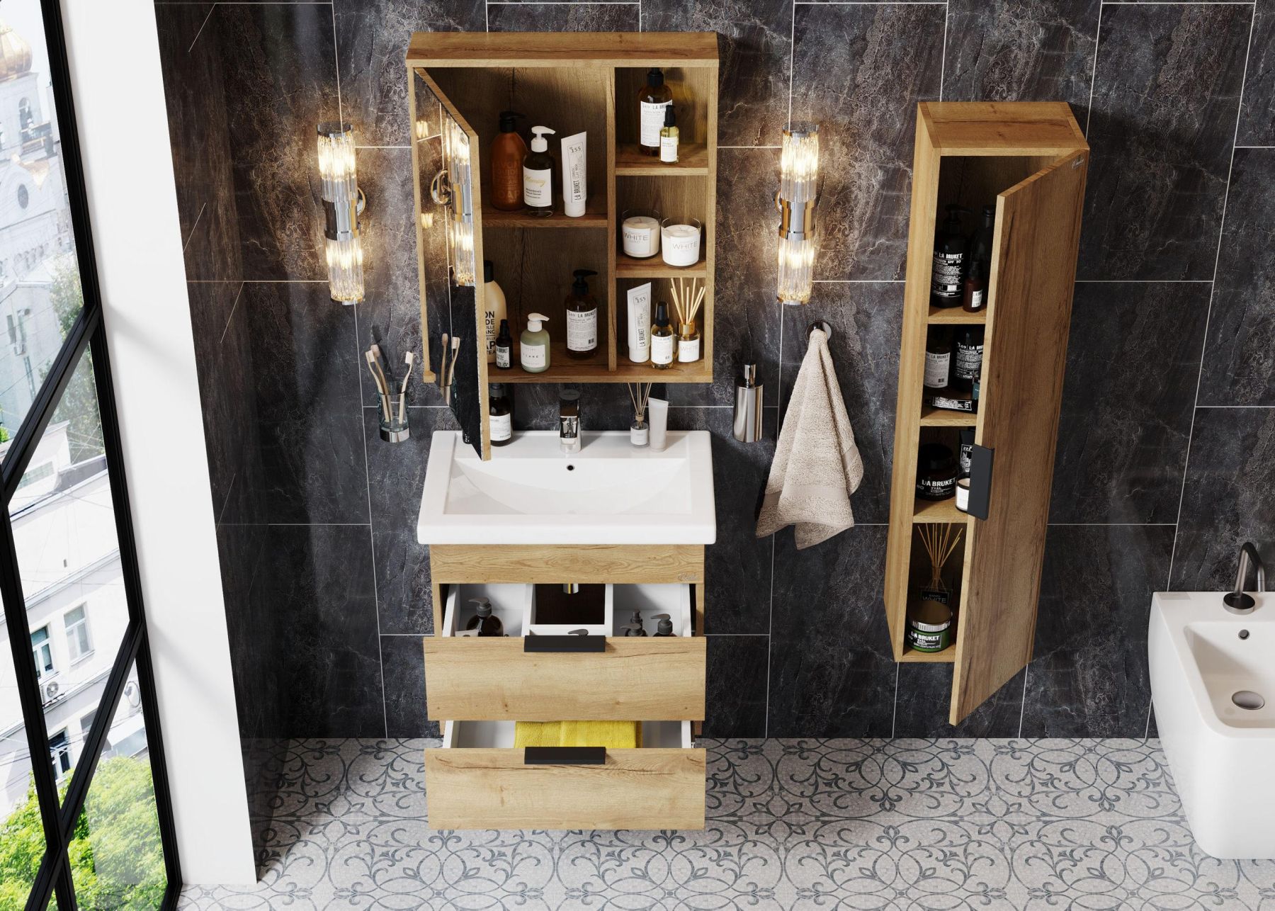 Роскошная текстура и натуральный цвет дуба подарят помещению дыхание природы и привнесет в ванную комнату ощущение гармонии.