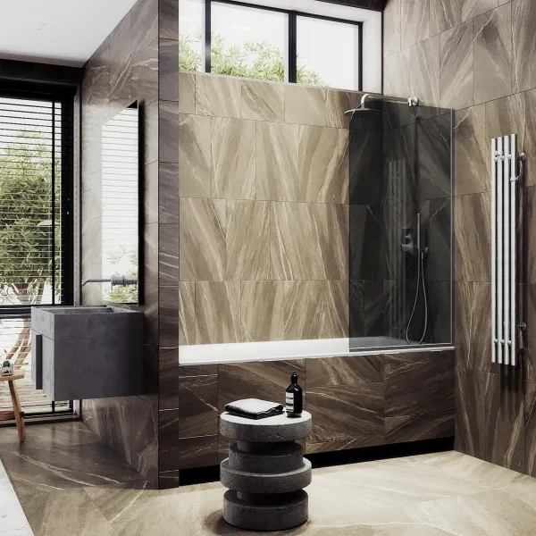 Монтаж осуществляется с помощью алюминиевого профиля, что обеспечивает надежность крепления и безопасность использования стеклянной перегородки для ванной. Также, шторка оснащена специальным уплотнителем, который предотвращает попадание воды на пол ванной комнаты. Закаленное стекло, цвет Графит, толщина 8 мм 1400х300 мм - 1 шт.