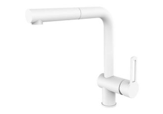 Смеситель для мойки с поворот.изливом и выдвижным 1 режим.душем из ABS, Белый матовыйСмеситель для кухни Paffoni Ringo RIN185BO.ВНИМАНИЕ! В монтажной схеме указан европейский стандарт подводки 3/8, мы предлагаем комплект, адаптированный к российским условиям со стандартом подводки 1/2.Комплектация: