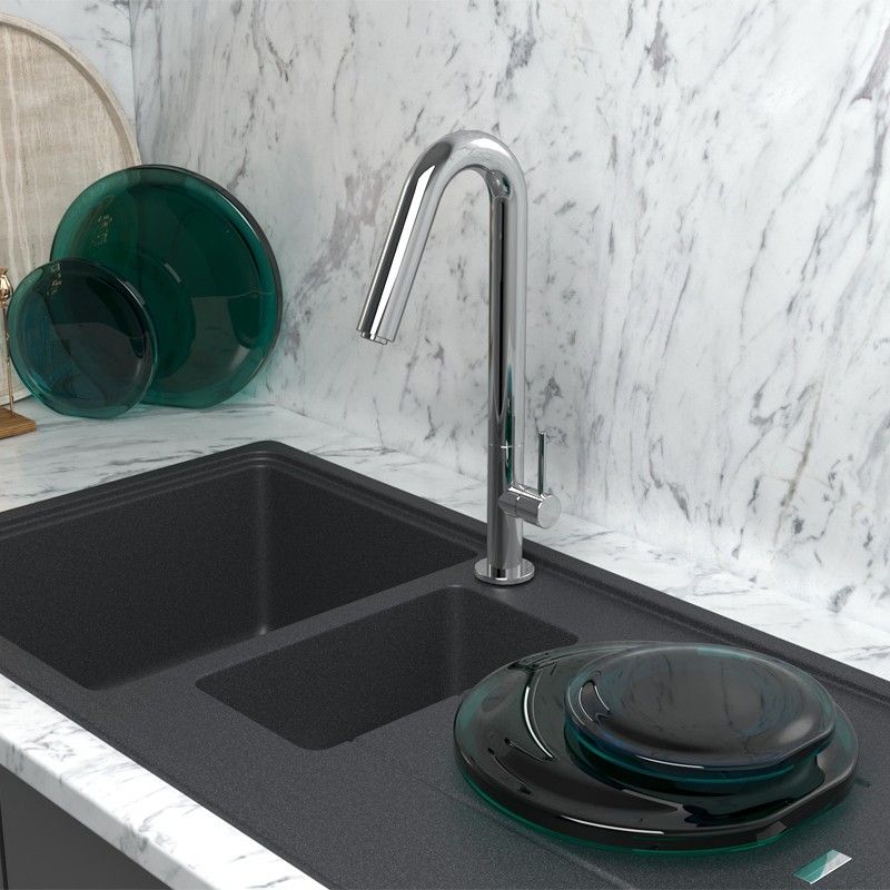 • Высокий корпус и поворотный излив дает больше возможностей при использовании на кухне.