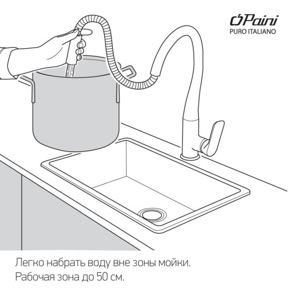 Смеситель для мойки Paini CRETA с выдвижным изливом подходит для любого размера кухонных моек.Высокий поворотный излив позволяет менять направление потока воды, использовать глубокую посуду, а выдвижная лейка удобна для того, чтобы набрать воду, помыть продукты и так далее.
