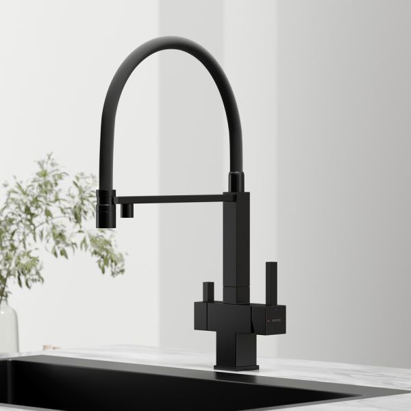 Смеситель для кухни SANCOS Moro с гибким изливом и возможностью подключения фильтра для воды, цвет матовый черный, арт. SC4006MBФункция "Холодный старт" - при включении смесителя активируется холодной поток, для экономии горячей водыАэратор, гибкая подводка, ключ и крепления для монтажа