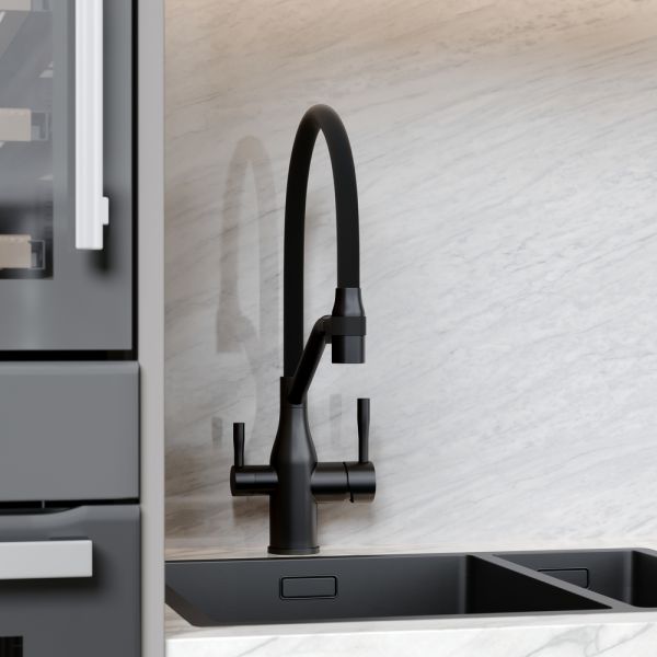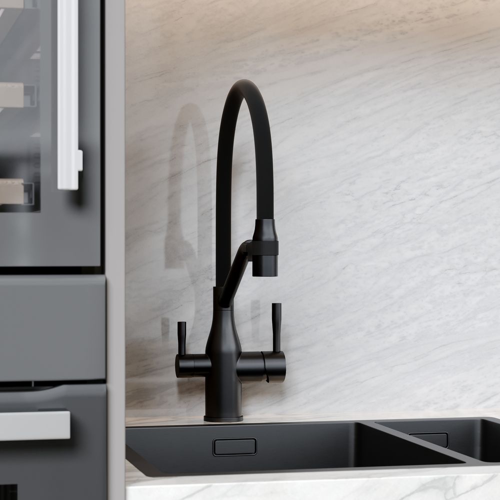 Смеситель для кухни SANCOS Orta с гибким изливом и возможностью подключения фильтра для воды, цвет матовый черный, арт. SC4008MBФункция "Холодный старт" - при включении смесителя активируется холодной поток, для экономии горячей водыАэратор, гибкая подводка, ключ и крепления для монтажа