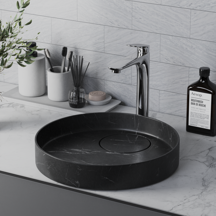 • Увеличенная высота корпуса смесителя позволяет использовать его с накладными раковинами и раковинами-чашами.