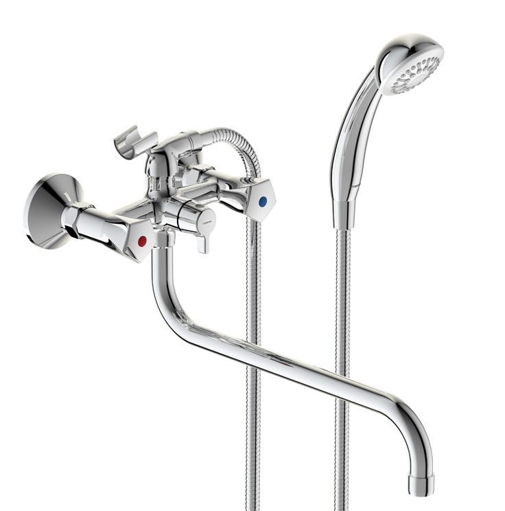 LIFE Смеситель для ванны/душа, поворотный излив 320 мм, душевой гарнитур в комплекте (душевая лейка Ø70 мм, металлический шланг 1500 мм, держатель для лейки).