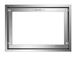 Металлическая декоративная рамка для использования вместе с монтажной рамкой. Закрывает неровные кромки настенной плитки. Декоративная рамка с регулированием глубины для отделки стен толщиной 5–18 мм (18–33 мм с использованием регулировочных болтов — арт. 9820181).