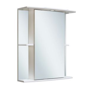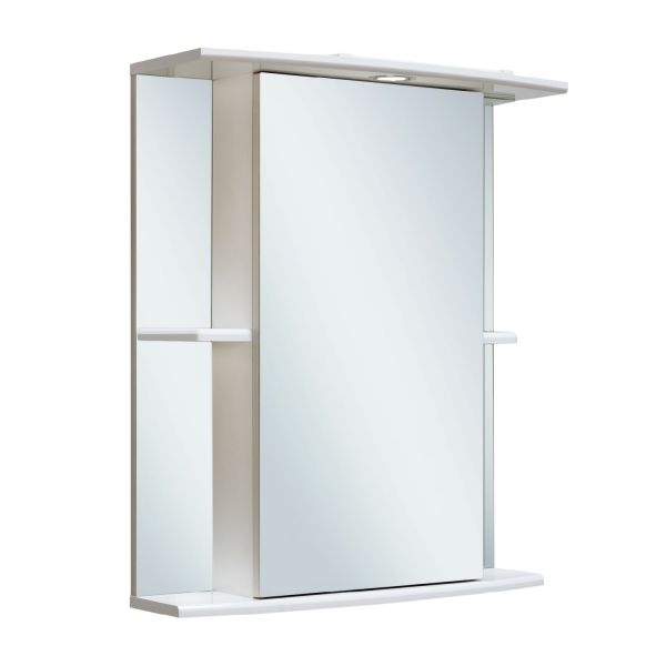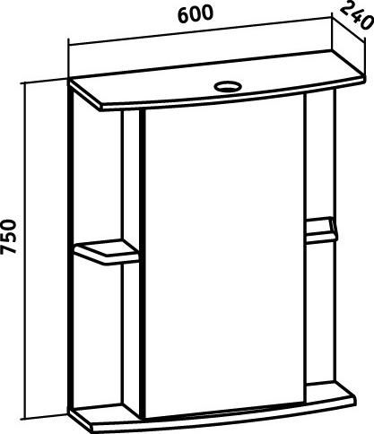Зеркальный шкаф оборудован одним врезным светодиодным светильником 220В и розеткой с выключателем. По центру - шкаф с зеркальной дверцей и двумя внутренними полками, справа и слева -по одной открытой полочке. Петли со встроенным доводчиком. Выпускается только в правом исполнении.