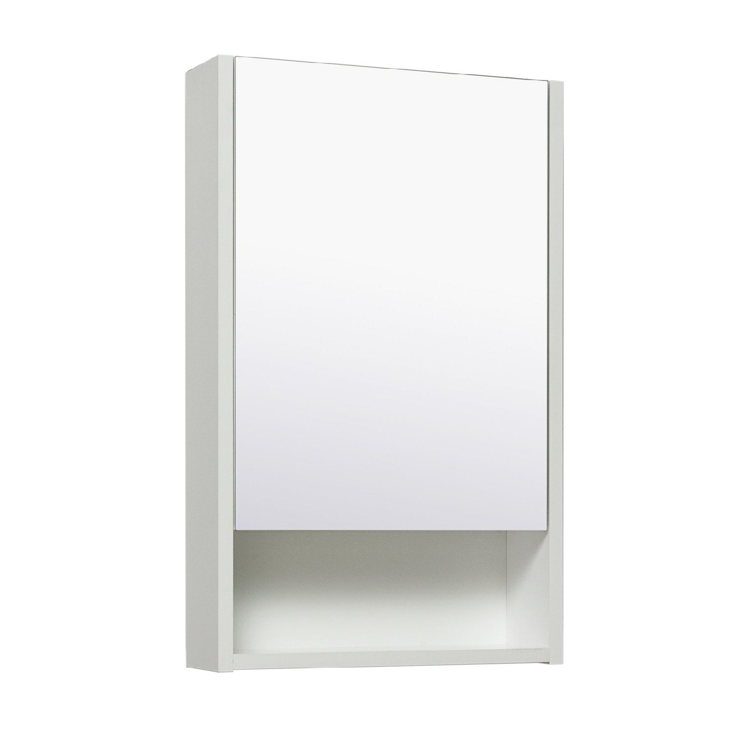 Зеркальный шкаф без подсветки с распашным фасадом и открытой нижней полкой (петли справа). Петли со встроеным доводчиком. Выпускается только в правом исполнении.