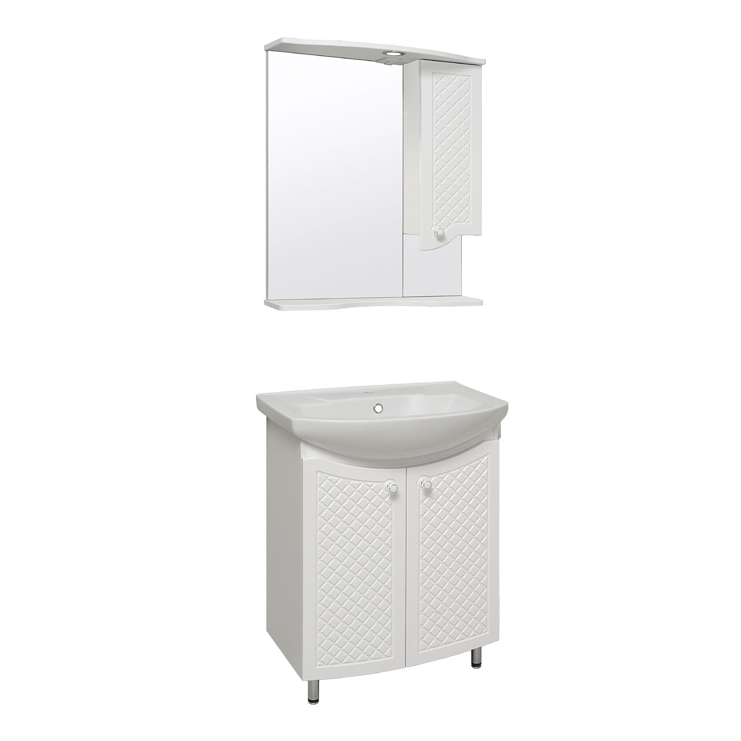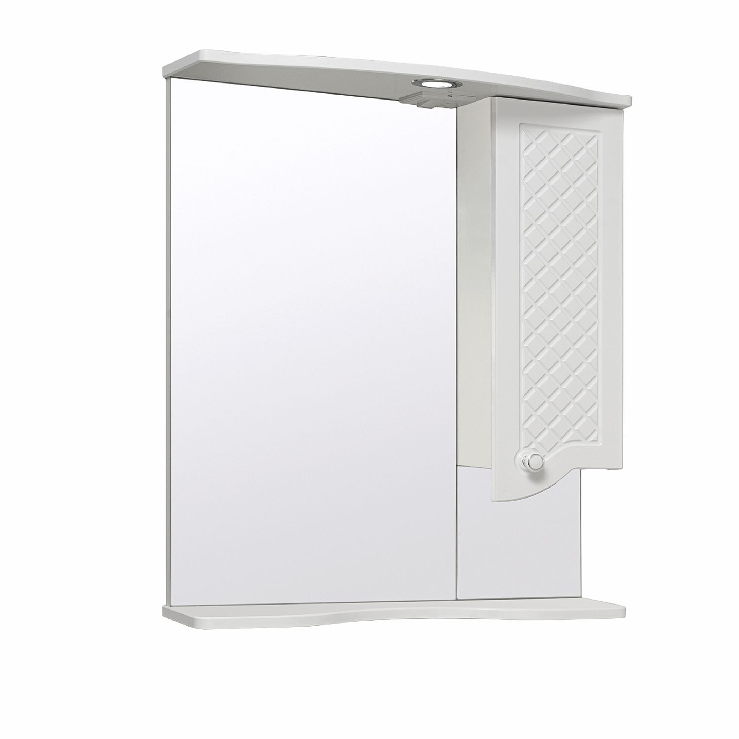 Зеркальный шкаф оборудован одним врезным светодиодным светильником 220В и розеткой с выключателем. Справа - шкафчик с распашной дверцей и одной внутренней полкой. Под зеркалом - нижняя полка. Петли со встроенным доводчиком, ручка - 1шт. Выпускается только в правом исполнении.