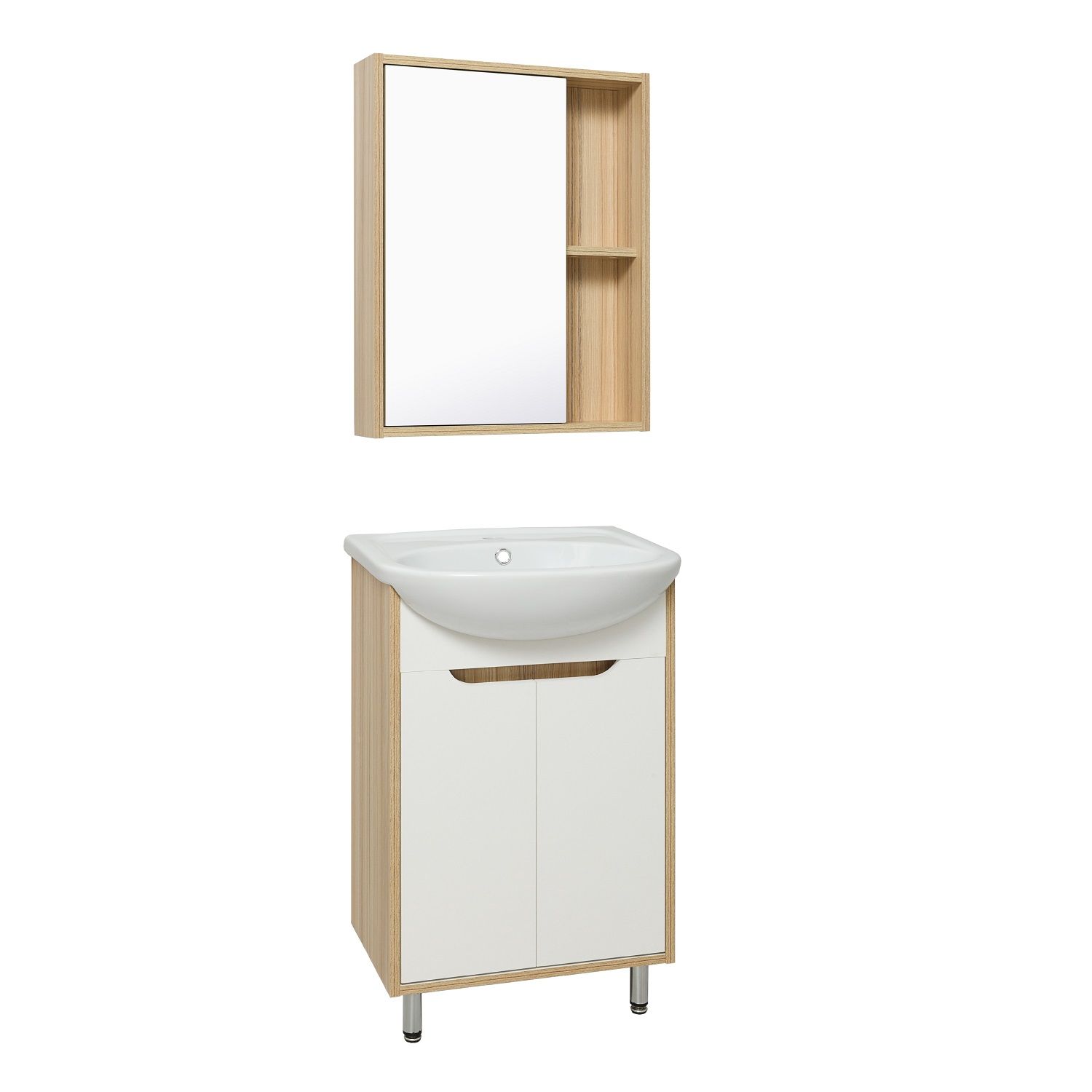 Зеркальный шкаф без подсветки с одной распашной дверкой и открытыми полками (слева или справа, зависит от установки). Внутри шкафа -одна внутрення полка. Универсальный.