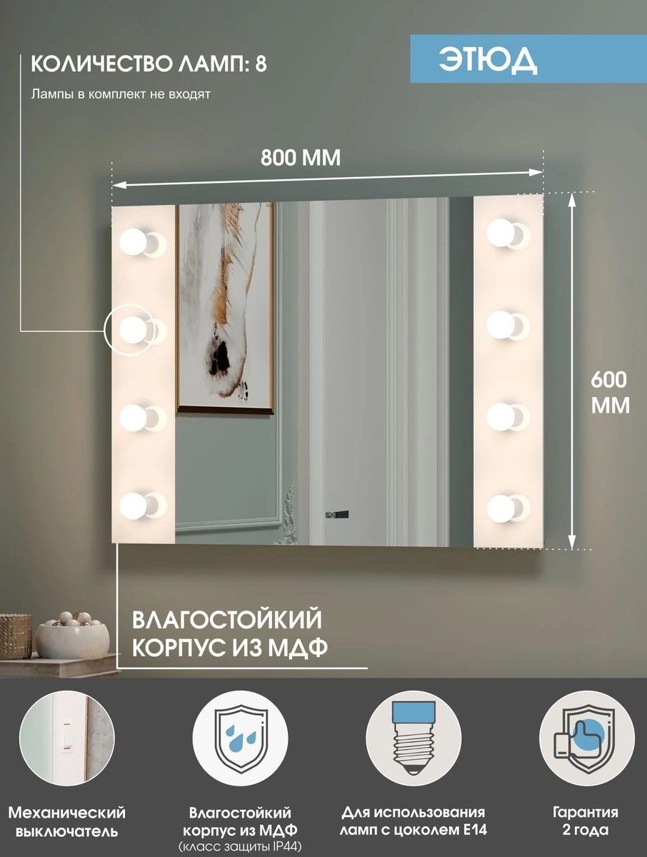 Гримерное Этюд встроенными Led лампами (8 ламп) 800х600LED подсветкафункция изменения теплоты подсветки (холодная/нейтральная/теплая)механический выключатель