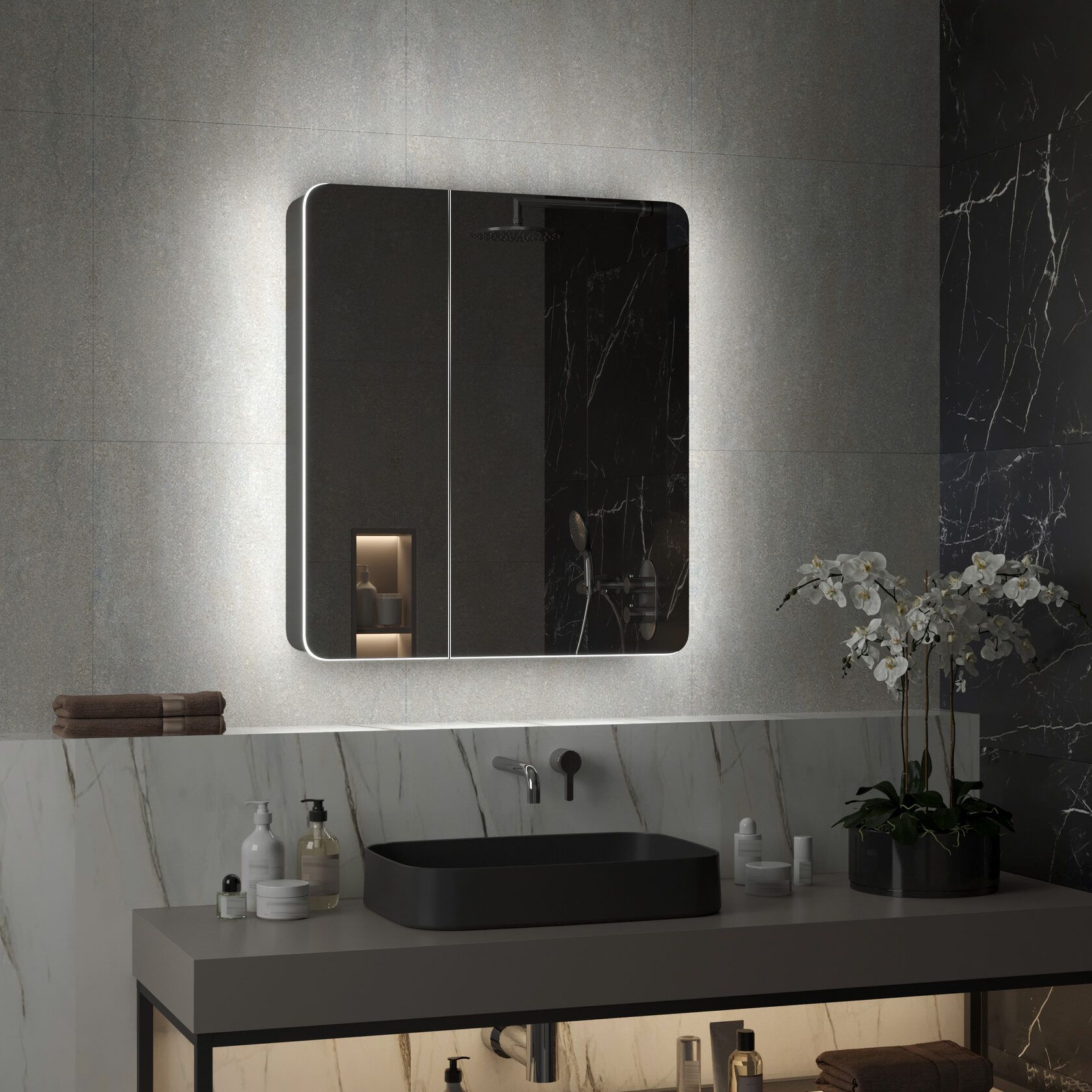 Представляем Зеркальный шкаф для ванной комнаты с контурной LED подсветкой Reflection Black 760х850 RF2002BL